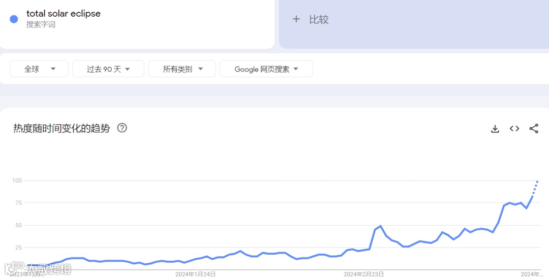 根据谷歌趋势搜索显示,过去90天内,“total solar eclipse”(日全食)一词搜索热度持续飙升,随着观测日期的临近,该词搜索热度达到100。