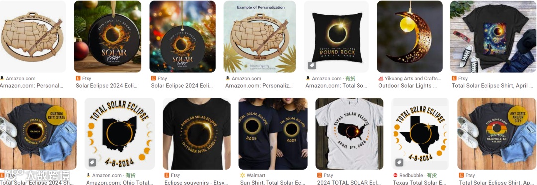 此类想法下,日食户外派对旗帜、日食气球、日食主题一次性碗碟等派对装饰品;日食T恤、日食贴纸、日食钥匙扣、笔记本等日食纪念品也在同步畅销。