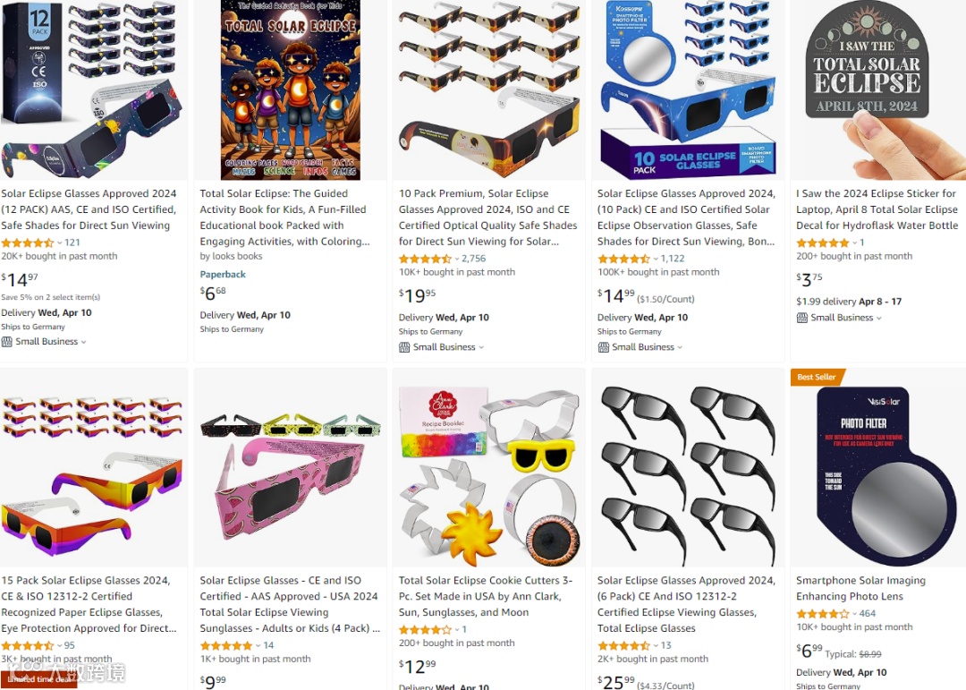 “solar eclipse glasses”(日全食眼镜)的周搜索量57万+,日全食天文现象热度的持续飙升,带动了观测眼镜的搜索热度及产相关品的销量增长。