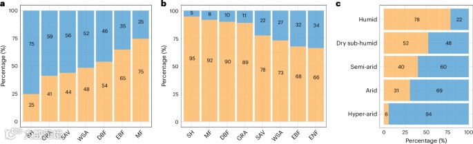 图 4:植物功能类型和干旱度对全球光合作用中SM和VPD相对作用的影响。(a)–(c):水分受限区域、能量受限区域以及沿WI梯度的SM和VPD主导像素的百分比。
