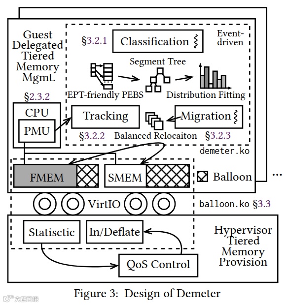 在每个来宾(guest)内运行 Demeter 组件,且与虚拟机管理程序(hypervisor)通过双气球(double‑balloon)接口协同,保证云环境下的弹性内存配给。 低开销采样(PEBS)
