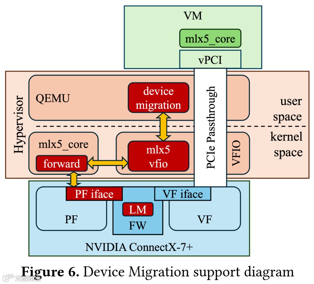 整个迁移过程涉及多个软硬件组件协同工作,以实现 RDMA 设备(如 NVIDIA ConnectX-7)在虚拟机实时迁移中的状态保存与恢复。此过程无需 Guest OS 参与,具有高性能、透明性和良好的兼容性。