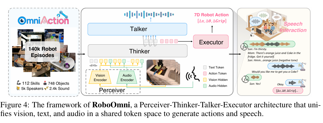 RoboOmni采用“感知器-思考器-对话器-执行器”(Perceiver-Thinker-Talker-Executor)架构,是基于端到端全模态LLM的机器人操作框架,能将语音、环境音、视觉与机器人动作统一到单一自回归模型中,通过统一 token 化将所有模态编码到共享语义空间,实现“感知到动作”的无缝生成。