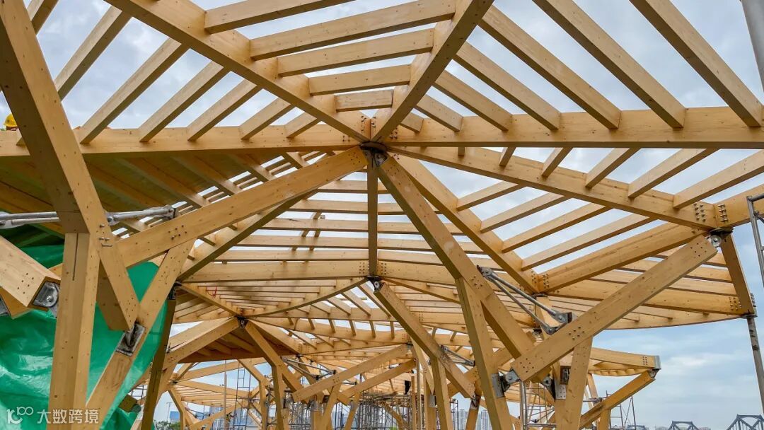该项目的支承结构采用互承式体系,由三根胶合木斜柱和三根钢结构桁架杆互相支承组成。工程师特意设计了梁柱连接节点,使节点达到理想铰接的力学性能,以充分发挥互承式体系的优点。