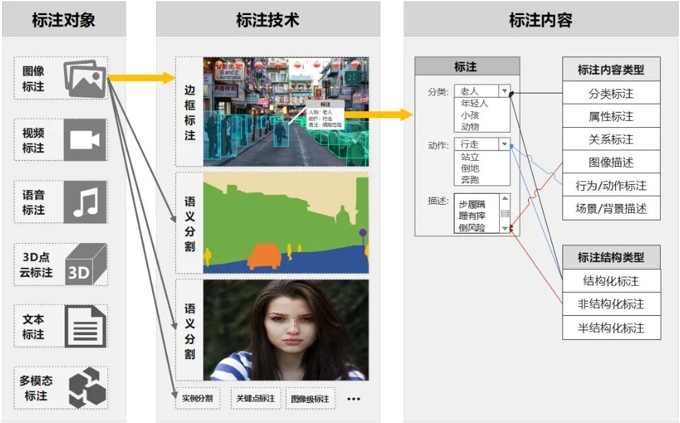 为了让这些抽象概念更具象、更易理解,我整理了一张标注维度总览图。图中从标注对象、标注技术到标注内容,逐一展开,帮助读者清晰地看到在实际工作中这些维度具体指什么、如何相互关联,并为后续的标注策略选择提供直观参考。