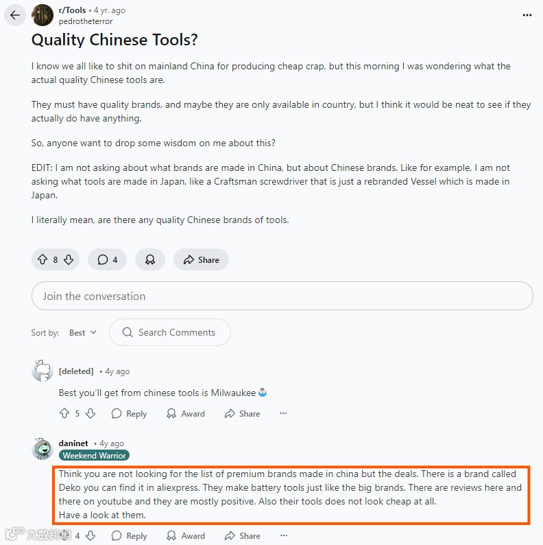 在亚马逊工具套装前十热销榜中,deko占据两席。同类电钻组合售价接近百元,相比之下deko产品仅需60美元左右,价格优势明显。同时在美国知名评价网站Judge.me,deko的超过一万一千条评论中评分高达4.9分。而在Reddit的相关话题讨论中,deko还受到网友的自发推荐。