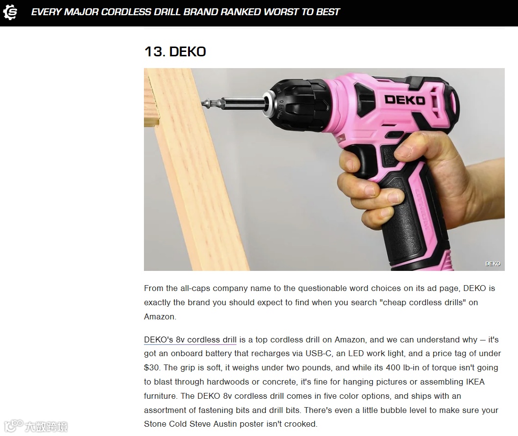 SLASHGEAR一个聚焦驾驶和DIY的老牌知名网站,今年2月推出了一篇“无绳电钻排名”的榜单,deko以价格和质量优势入榜,成功帮助产品吸引了不少消费者。