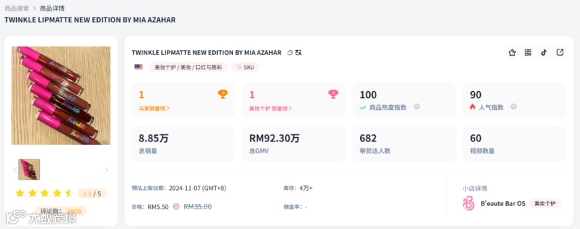 - 闪亮唇彩:马来西亚小众品牌B'eaute Bar OS旗下产品,售价1.2美元,销量达8.83万件,总销售额约20.8万美元[2]。