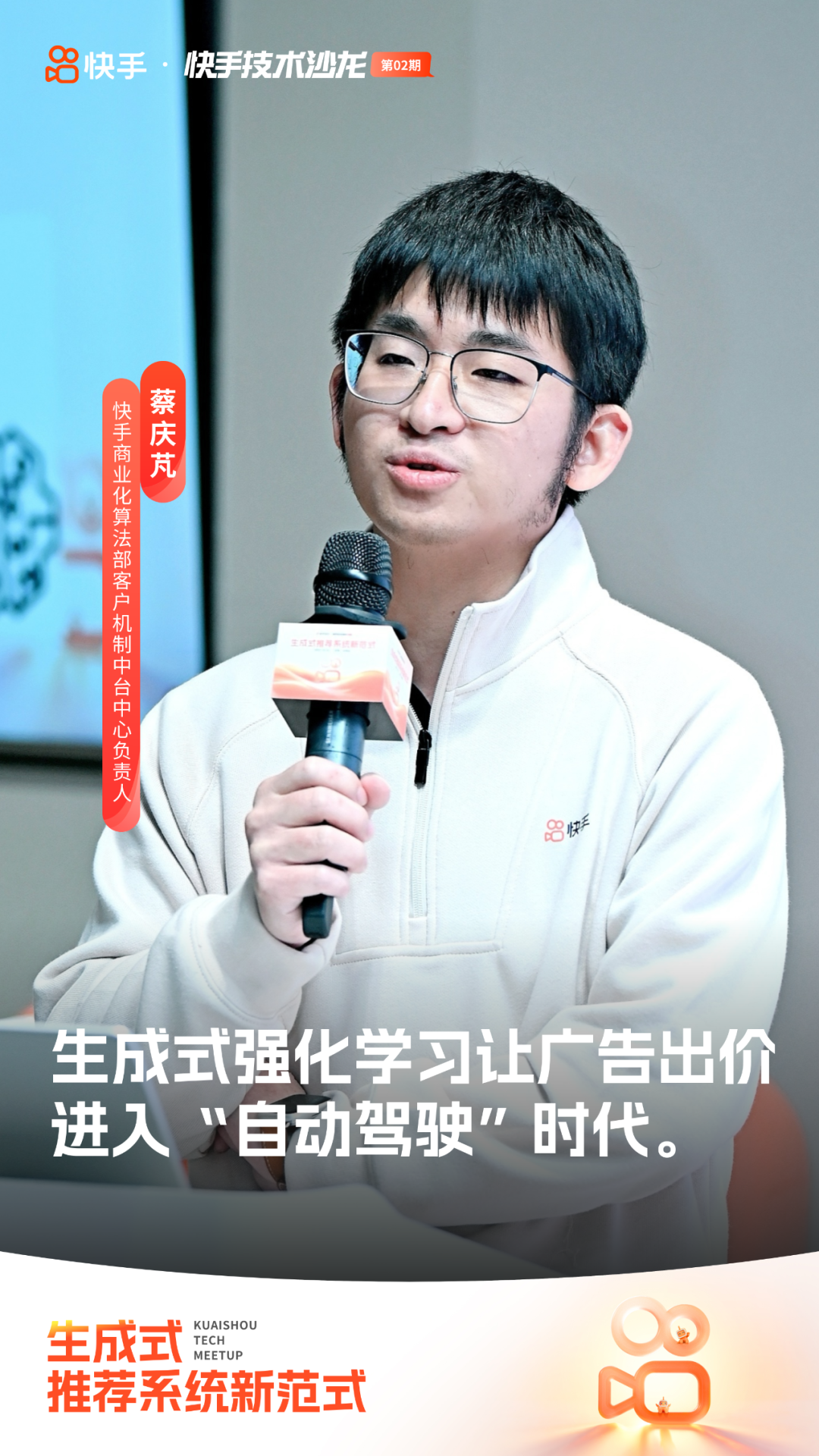 快手商业化算法部客户机制中台中心负责人蔡庆芃,分享了快手出价技术的三代演进,以及如何提出生成式强化学习出价范式G4RL。目前,快手已将这一技术全面应用于广告系统,2025年至今推动广告收入提升超过3%,并针对依赖高质量数据集以及难以和优化目标对齐的挑战,分别提出GAVE和CBD算法。