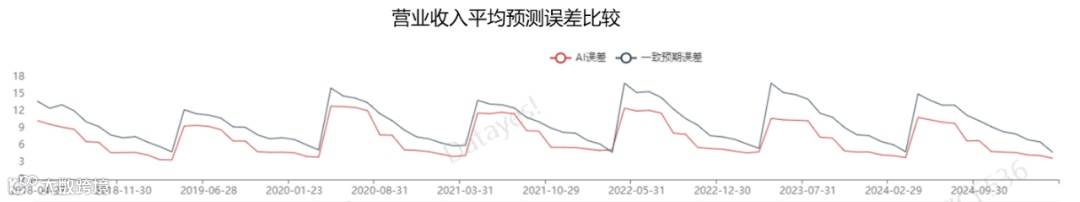 AI盈利预测数据素来以准确性和稳定性著称,如以2024年年报数据对比来看,在2025年1月底,通联数据提前发布的全A上市公司(有分析师覆盖的)营收预测数据与实际数据的误差中位数为4.33%,显著优于券商分析师一致预期的误差,且在多年的样本外对比中平稳跑赢券商分析师预期。