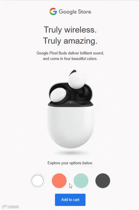 谷歌在推广新款 Pixel Buds 耳机时使用了图片轮播 AMP 组件:用户无需跳出邮件,就能选择耳机颜色并加入购物车,图片会根据所选颜色实时变化。