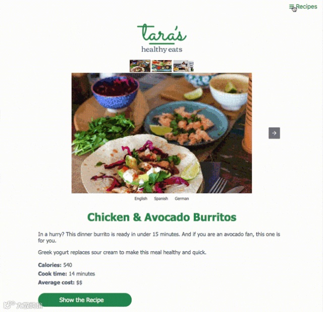健康饮食品牌 Lara’s Healthy Eats 的案例展示了侧边栏的用法:通过侧边栏可访问其他内容,同时不会让邮件体积过大。