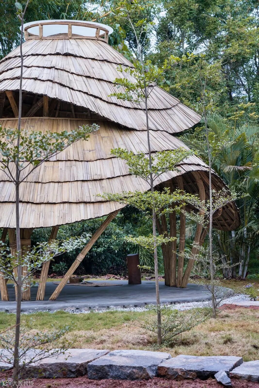 凉亭由几种不同种类的竹子和藤条精心建造,融合了多个拱门和环梁,创造了一个底层框架来实现结构强度。这种结构的复杂性不仅是技术上的壮举,更是美学上的追求。