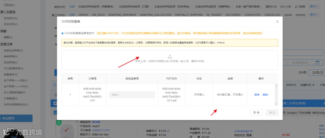 原【导入面单】需命名“订单号#运单号”,人工成本高。新增【OCR识别面单】功能,只需将PDF文件命名为“订单号”,系统即可通过OCR技术自动识别运单号,用户仅需核对确认,大幅提升效率[k]。
