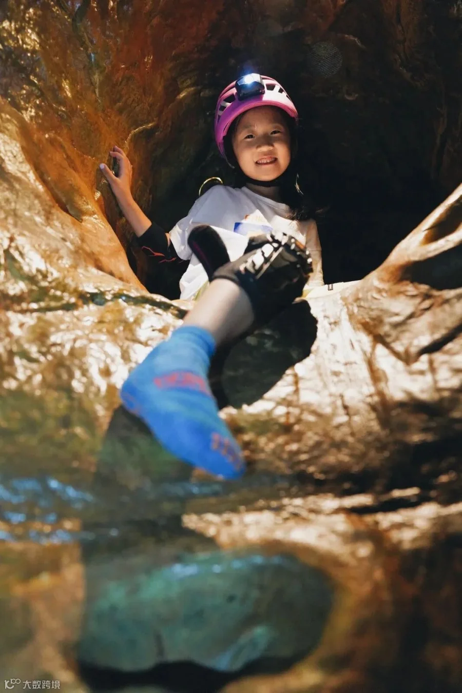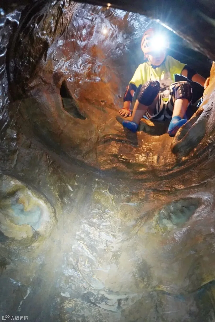 店内免费提供专用的探洞装备,小朋友们可以根据自己的尺码挑选。工作人员亲自穿戴完毕,并检查装备的安全性。护膝、护肘、头盔、提供照明的头灯…都缺一不可。