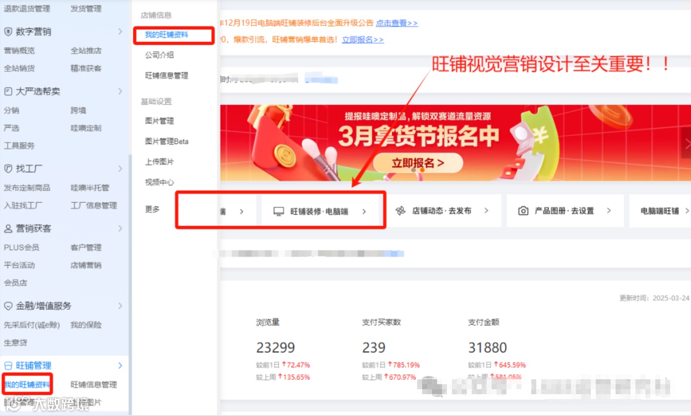 3.店铺装修是吸引顾客、提升购物体验的关键因素之一,尤其在竞争激烈的电商环境中。一个精心设计的店铺界面不仅能增强品牌形象,还能有效提高转化率。针对电脑端和无线断的装修,可以进行AI设计,做符合采购心里的智能匹配,在装修过程中,要保证分值在90分以上。