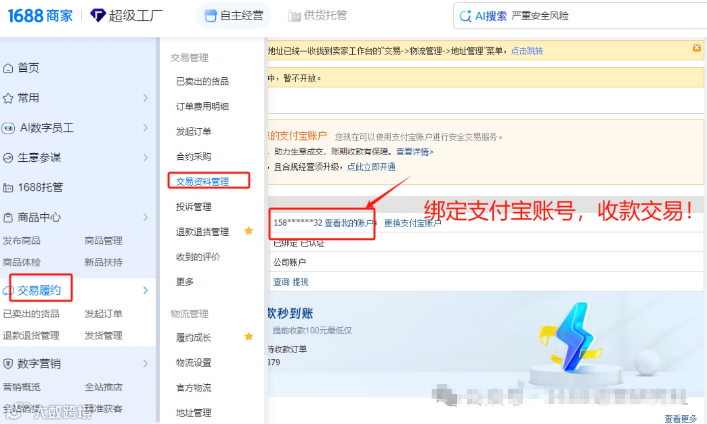 2.完成店铺信息的完善后,绑定支付宝账户是确保日常收款交易顺畅的重要步骤。通过绑定支付宝,您可以安全、快捷地管理来自线上销售的收入,实现订单款项的自动结算与即时通知。