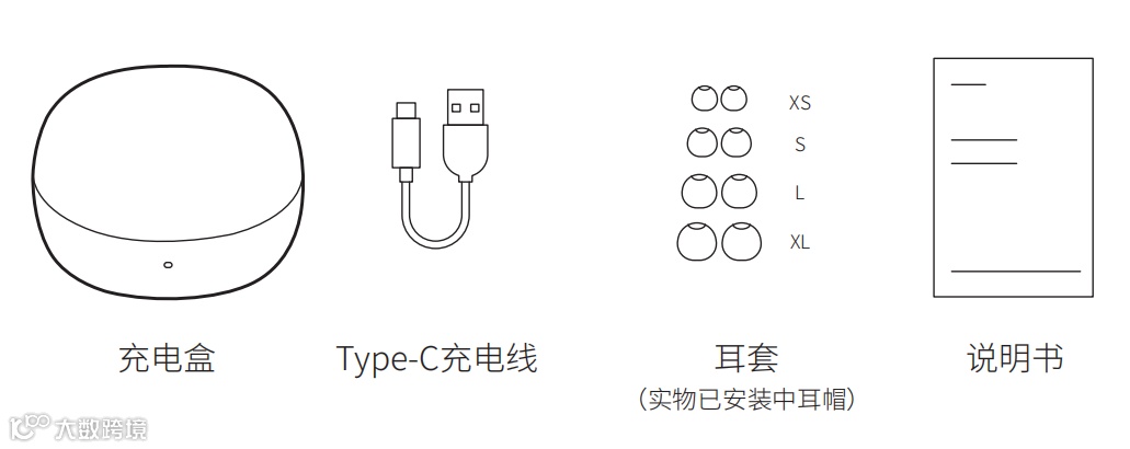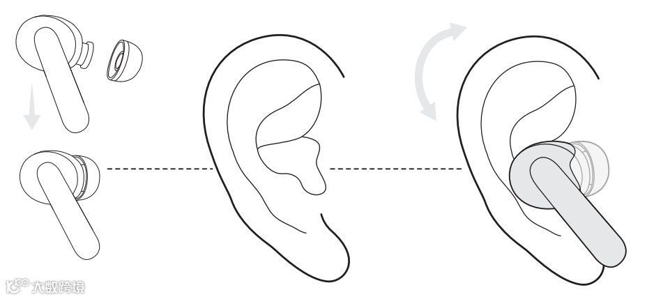 1.请选择最合适的耳塞尺寸更换到耳机上,并正确佩戴左右耳机,戴上耳机后可微微转动调整,找到个人舒适且稳固的位置。