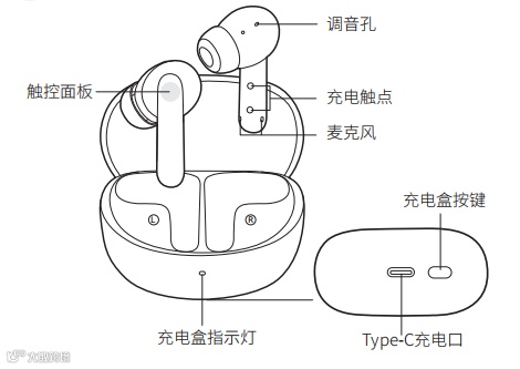 1.打开充电盒,耳机将自动开机。当耳机在充电盒外并处于关机状态时,长按触控面板 1.5 秒开机。