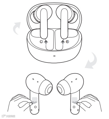 1.取出两只耳机 ,同时撕掉耳机上的隔离膜,再将两只耳机放回充电盒中,合上充电盒盖子。(此步骤为新机激活)