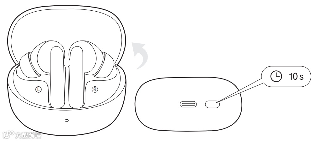 耳机在充电盒内,充电盒开盖。长按充电盒按键10秒,充电盒红白灯交替闪3秒,复位完成,随后合盖5秒即可正常使用。