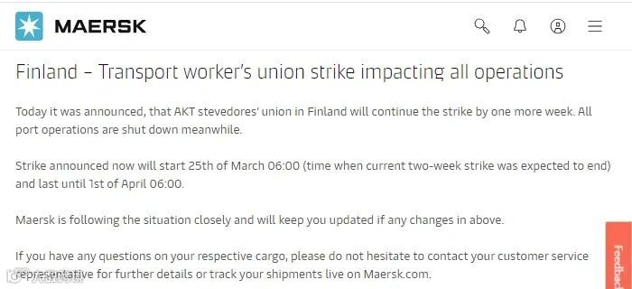 在这期间,芬兰各港口运营已全面关闭,物流运输将受到严重影响。其中船舶装卸、集装箱提货和交付业务等全面停摆,并且由于罢工影响,空运物流可能会出现延误或额外的费用产生。