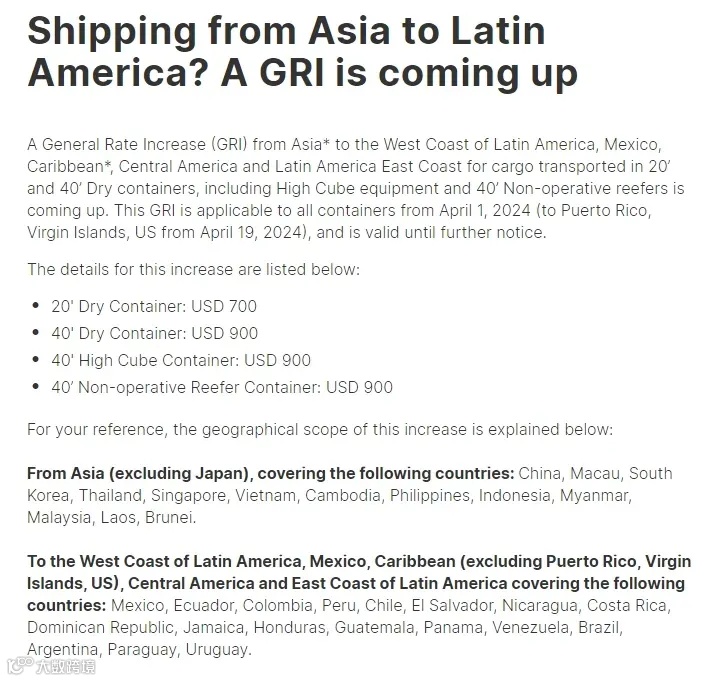 • 中远海运:从2024年4月1日起 至2024年4月14日,海运费将出现大幅度上涨,涨幅约为1000至2000美元。
