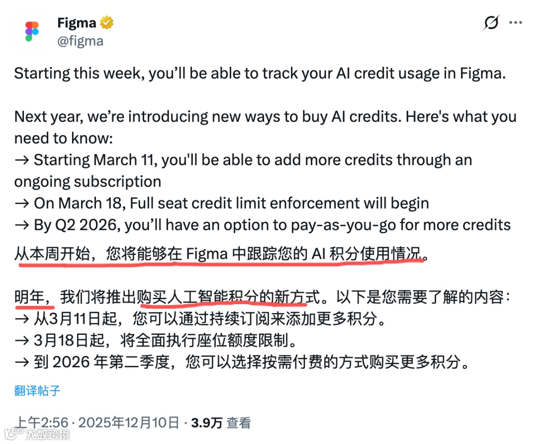 这不, 12 月10 号 Figma 在 X 上已经发出 AI 积分最新公告。