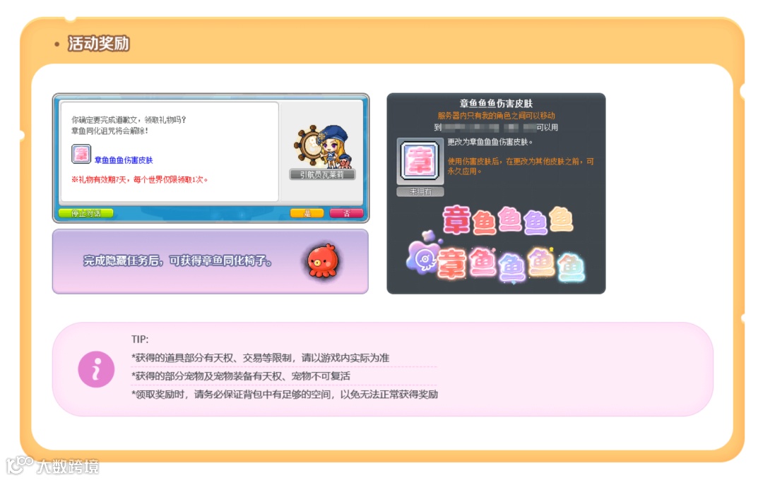 活动内容:左侧图标处参加解除章鱼同化诅咒活动,章鱼同化诅咒是遭到集中扫荡的章鱼们下的诅咒,去跟头上顶着章鱼的3个人对话,告诉他们自己原本是人类,解除章鱼同化诅咒吧!
