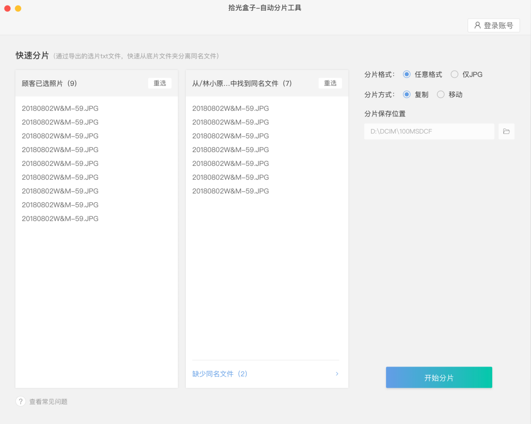 点击“开始分片”按钮,选择源文件夹即可分片,无需额外导出txt文件,更加方便快捷~