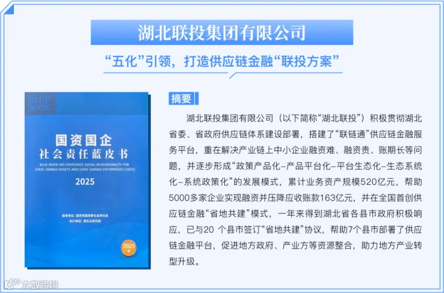 会议以“勇担新使命 践行新担当”为主题,集中发布并解读《中央企业社会责任蓝皮书(2025)》《中央企业上市公司环境、社会和企业治理(ESG)蓝皮书(2025)》《国资国企社会责任蓝皮书(2025)》,全面展示国资国企履责实践和积极成效。同时还发布了全国留守儿童关爱保护“百场宣讲进工地”暨“中央企业同心护未来”社会责任行动。湖北联投“‘五化’引领,打造供应链金融‘联投方案’”入选《国资国企社会责任蓝皮书(2025)》责任供应链创新篇。