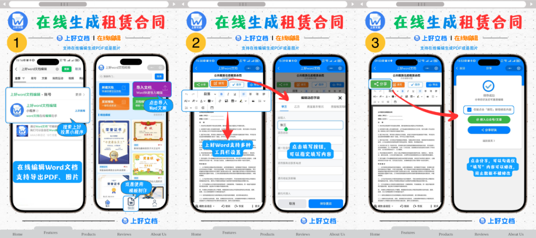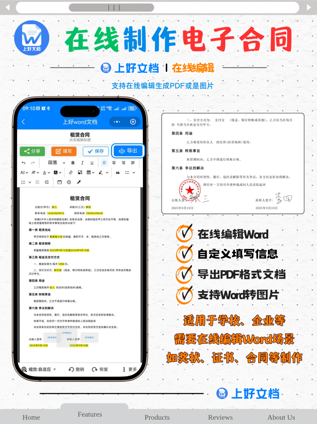 上好文档小程序可以在手机上完成电子签章,还可以指定他人填写文档中的特定内容,适合合同、协议、请假条等日常办公场景。