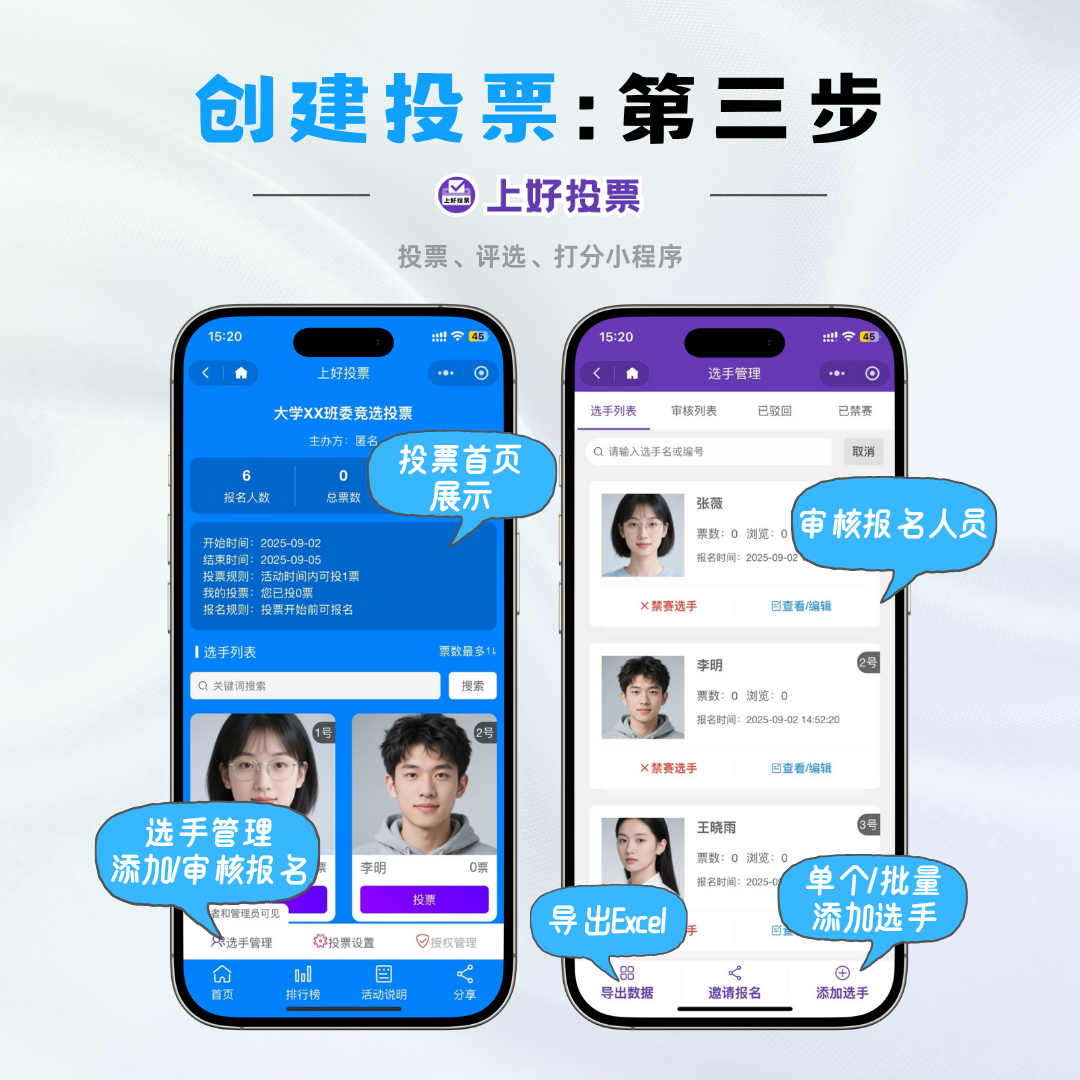 上好投票是一款完全免费的投票小程序,操作简单、新手也能快速上手。无论是社团评选、创意征集、摄影大赛还是短视频比赛,它都能帮你一站式管理报名、投票、结果统计。