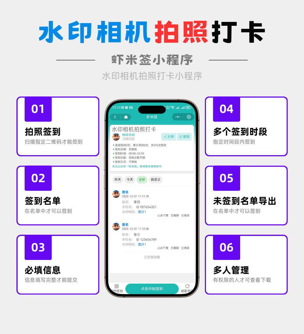 虾米签的水印相机可以在拍照时自动添加时间、地点等信息,记录过程更真实可靠,同时照片可直接作为打卡凭证,无需额外操作,节省管理时间。