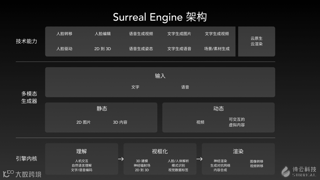 2022年7月,诗云科技推出多模态内容生成引擎Surreal Engine,将内容生产分为Understanding(理解)、Framing(视框化)、Rendering(渲染)三个步骤。区别于市面上的两大3D内容创作巨头:Epic Game的Unreal Engine和Nvidia的Omniverse,Surreal Engine让普通人也可以轻松进行高维度、可交互的内容创作。