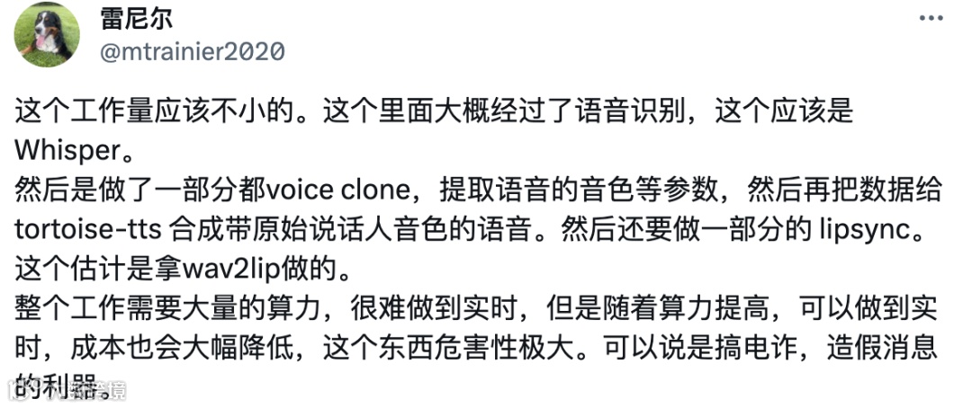 一位网友就表示需要至少三步才能达到这种效果,Whisper识别、Tortoise-TTS合成带原始说话人音色的语音、Wav2lip换嘴型。