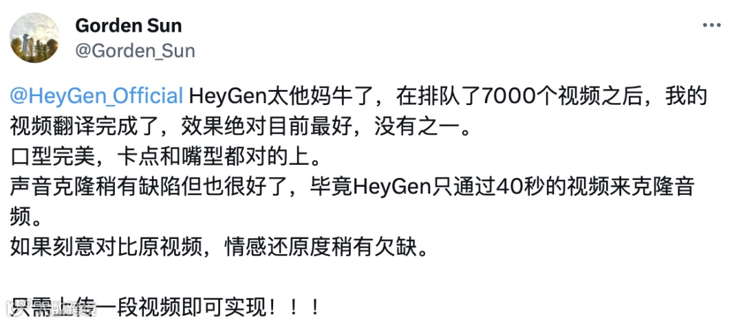 网友@Gorden Sun也复刻了一段霉霉说中文的视频,在排队等待7000个视频后,用HeyGen制作的视频翻译终于完成了。并直言:“效果绝对目前最好,没有之一”。