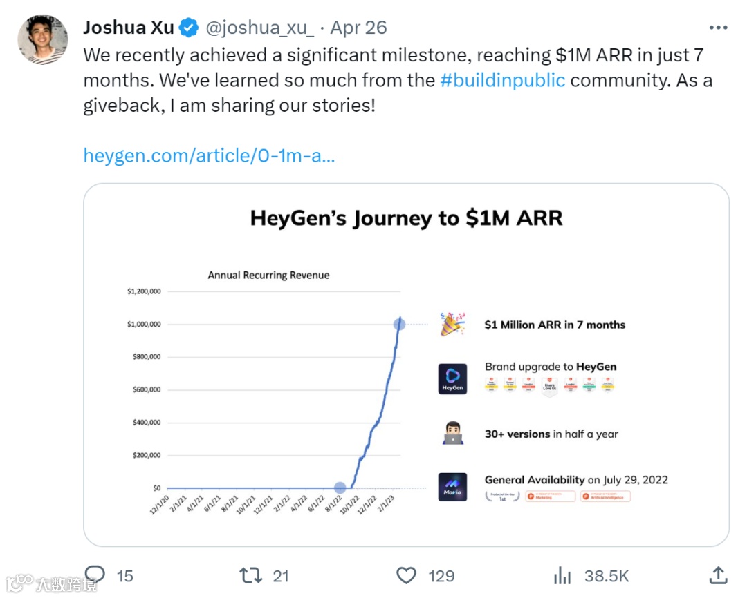 不仅如此,HeyGen的产品正式上线后的一年不到,创始人Joshua Xu就发表博文表示:HeyGen在7个月内实现了100万美元的ARR(年度经常性收入),并保持连续9个月50%的月环比增长率。