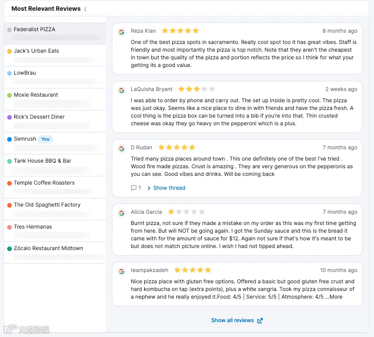 评论分析报告包含了一个最相关评论的小工具,你可以查看每个竞争对手的顶级评论的全部文字,以及商家的回应。用它来整理有关竞争对手的评论报告,并获取他们的评论概况的分析。报告包括如下数据:
