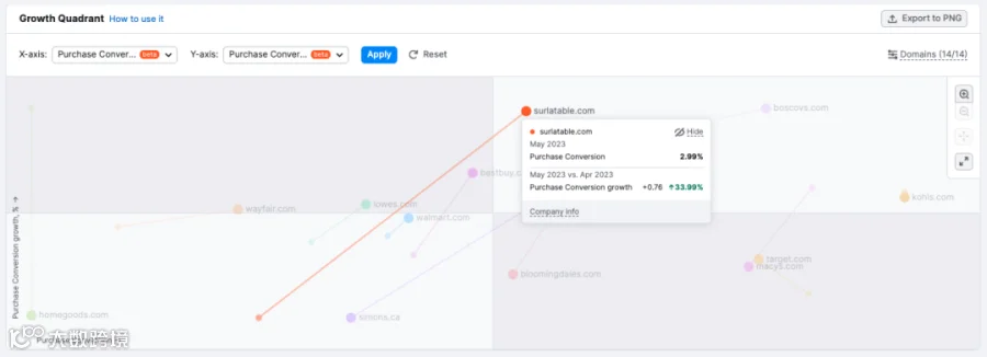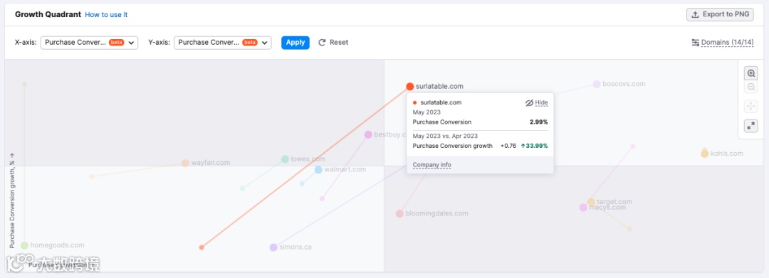 我们还添加了一个新的指标:购买转化率(Purchase Conversion)。它使用点击流数据估计一个竞争对手的网站最终转化为购买的访问数量。