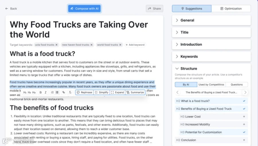 但这还不是全部。借助新的“咨询AI”功能,SEO写作助手还可以帮助您完成文章最后的FAQs部分。只需提出您的问题,工具将为您撰写一个答案,供您在内容中使用。