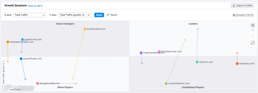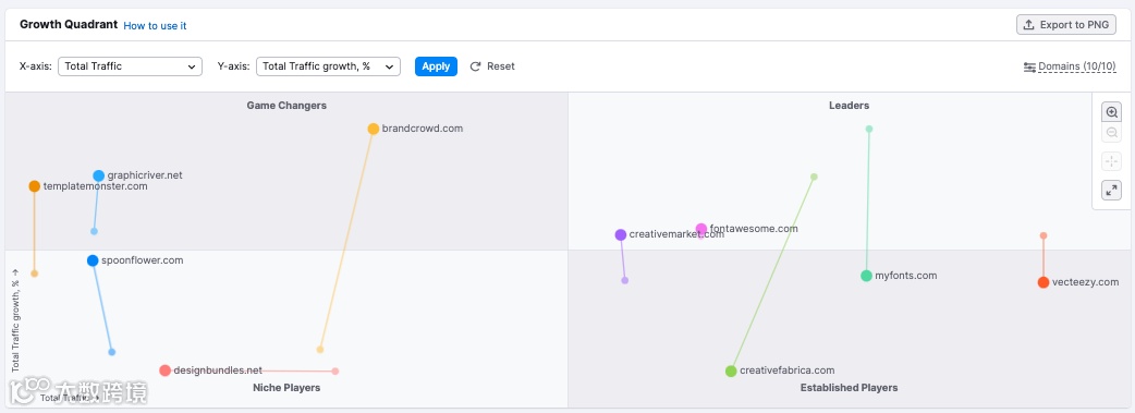 增长象限现在可以分析多达100个独立域名,使其比以往任何时候都更全面。而且,通过新的增长路径功能,您可以即时了解市场中的增长趋势。