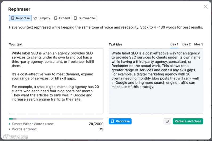 首先,重新表达功能(Rephraser)可以帮助您节省宝贵的时间来重写短文。它可以在几次点击之内对文本进行改写、简化、扩展或总结。