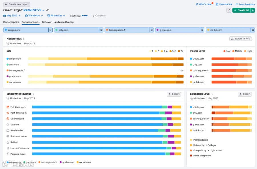 该工具有四种报表,探索受众的人口统计信息、在线行为、社会经济状况,甚至与竞争对手的重叠情况。了解您的受众: