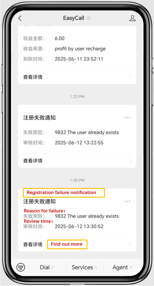 (1) If this user is using EASYCALL as invited by another agent, your invitation will be deemed invalid and you will receive a registration failure notification as shown in the following diagram in the Service Tag event message.