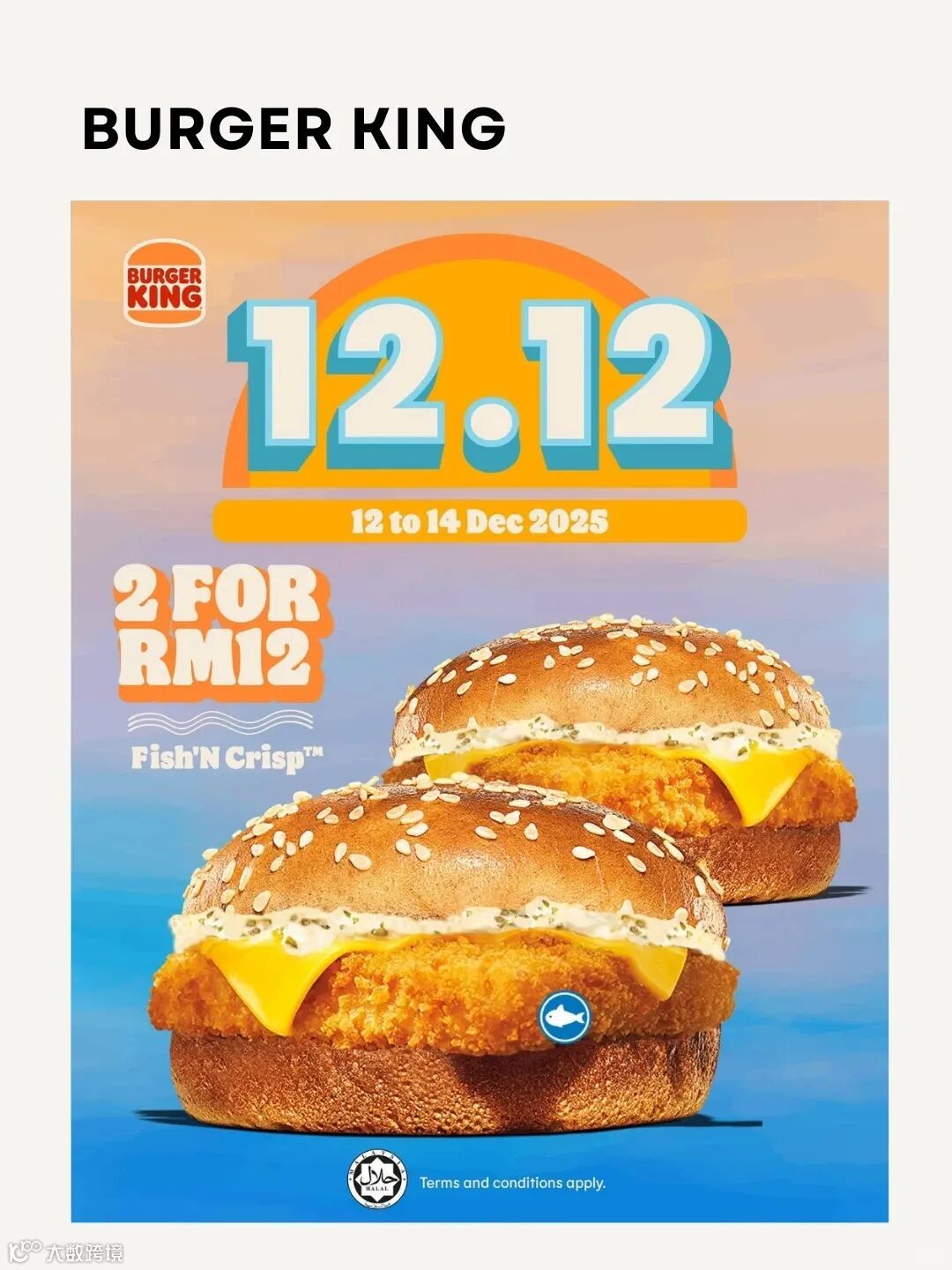 即日起至12月14日,Burger King 推出鱼柳堡买一送一优惠,两份只需RM12,相当于一个汉堡RM6,午餐晚餐都很划算。