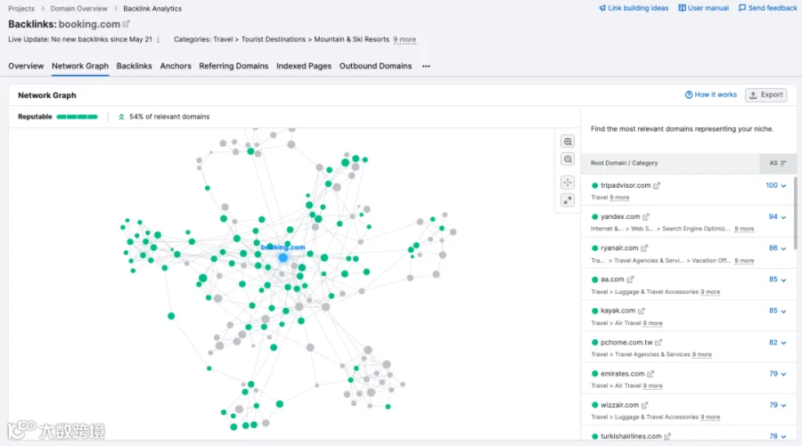 您可以使用它来了解竞争对手、潜在客户或自身的信息!在反向链接分析工具中查找网络图报告。