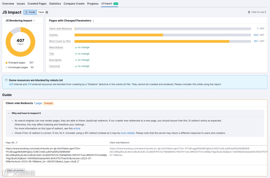 但这还不是全部。我们还添加了JS影响报告,它能够识别您的JavaScript未按预期进行渲染而可能导致排名下降的问题。