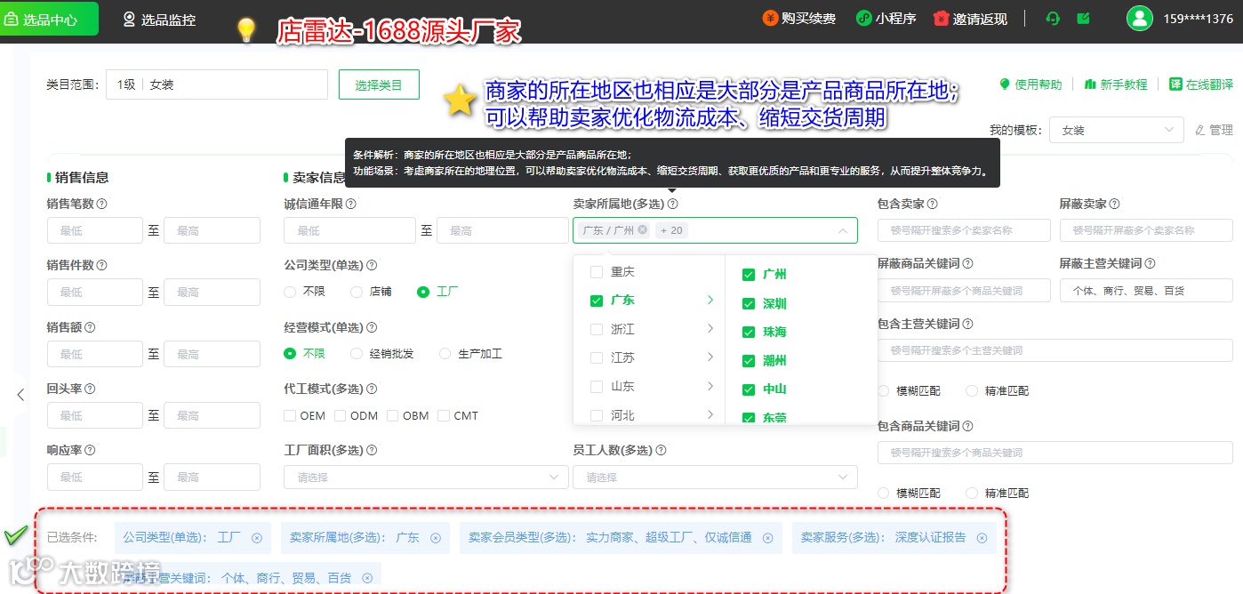 还有很多的筛选维度,例如通过销售笔数件数的区间筛选,可以帮我们筛选出有一定客流且产品质量不错,客户认可的供应商;回头率及响应率可以帮我们筛选出,处理询盘和沟通的速度较快且有回头客的好口碑供应商。