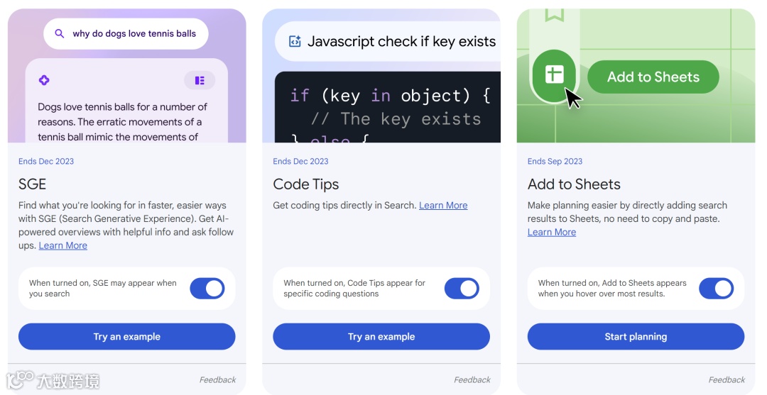 在收到测试资格的邮件通知后,需要先在个人帐号中启用Google SGE功能,操作步骤很简单:在Google搜索界面中,点击右上角 Search Labs 图标,就能进入Google SGE启用界面,还顺带可以启用 Code Tips(在搜索结果中直接展示代码) 以及 Add to Sheets(将搜索结果一键添加到Google Spreadsheet中) 功能,如下图所示: